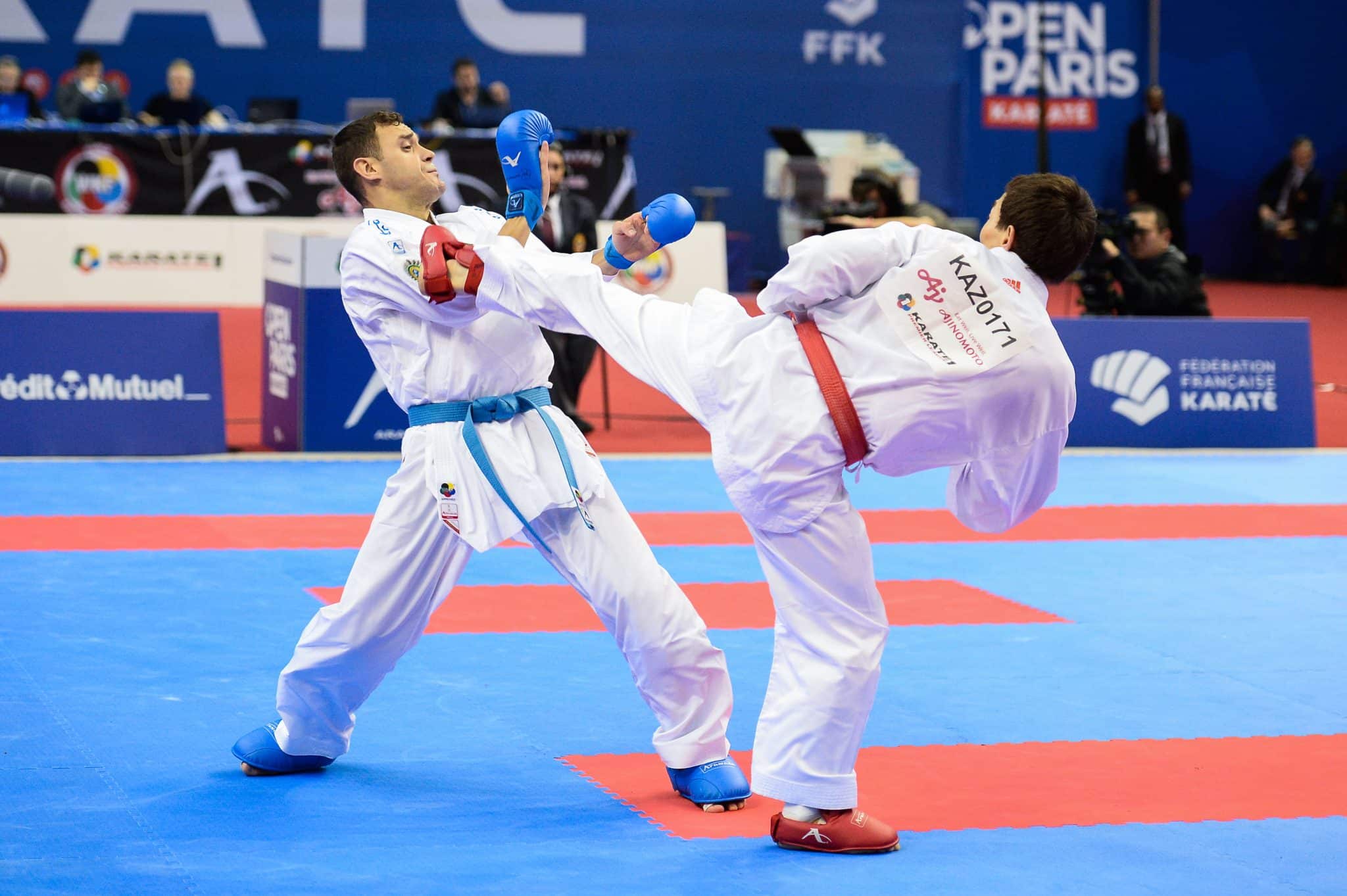 Em seguida, ele deve prestar atenção à reação dos quatro juízes posicionados nos cantos do tatame, que têm bandeiras vermelha e azul. Se dois ou mais juízes concordarem, o carateca receberá a pontuação.