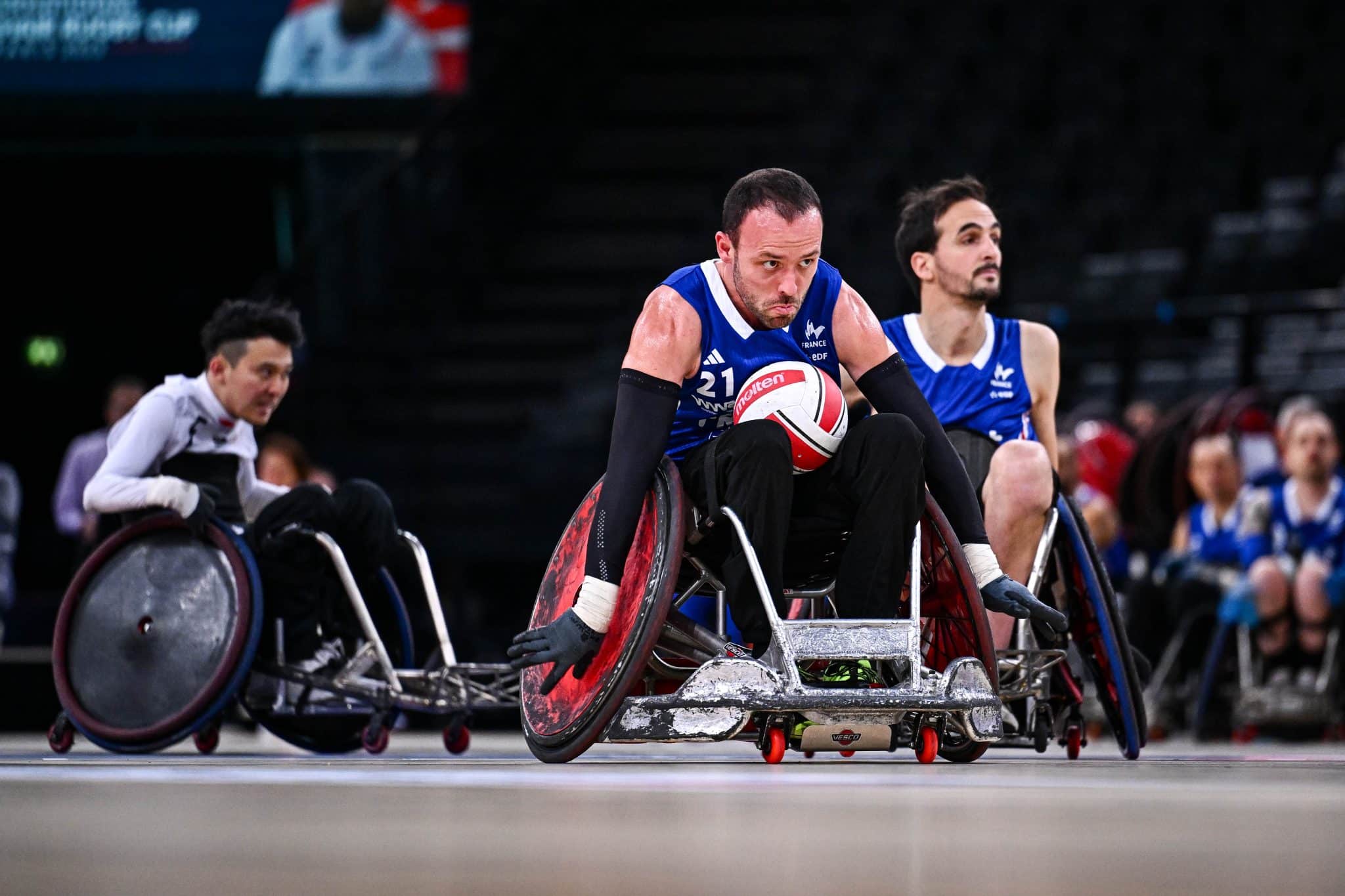 O rugby em cadeira de rodas é um esporte inclusivo jogado por homens e mulheres com paralisia em todos os quatro membros.